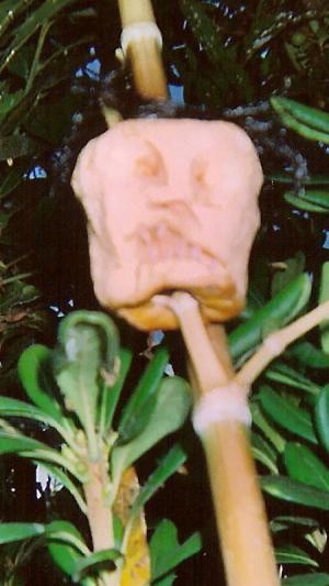 To one side of this heavily webbed area was a section of wall with several chains and two axes hanging from it like a miniature torture chamber, in front of which was the keg. To the other side, in front a large tree, Dana and Bobby had placed several skulls and shrunken heads on spikes, some head-hunter spears, and a Tiki torch that burned out early on in the night.