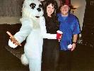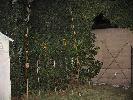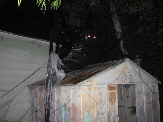 Further back in the yard was a tool-shed up against the garage wall, and atop this was a giant spider similar to years past, this time constructed of 55 gallon trash-bags that Shannon had filled with crumpled newspapers. Two legs were perched high above on the garage roof, four surrounded the body on the tool-shed, and the last two were on the ground in front, giving the impression of it climbing down at you. Within the tool-shed itself was a strobe-light flashing on several smaller spiders, and a large one hanging in the center Rowland had made from plastic skeletons, with a rib-cage body, skull, and eight skeletal arms.
