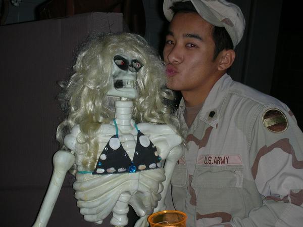 Dana and Bobbie built what is, hands down, our best decoration ever: a ghostly pirate ship emerging from and above the garage! It had two masts with sails and a pirate flag, rigging and cannons. The front was adorned with a skeleton mermaid, another skeleton sat in the crow's nest, and with hands slowly turning the wheel, the captain floated in mid-air, fluttering in the wind of a fan (that also powered his turning arms) and lit with black lights.