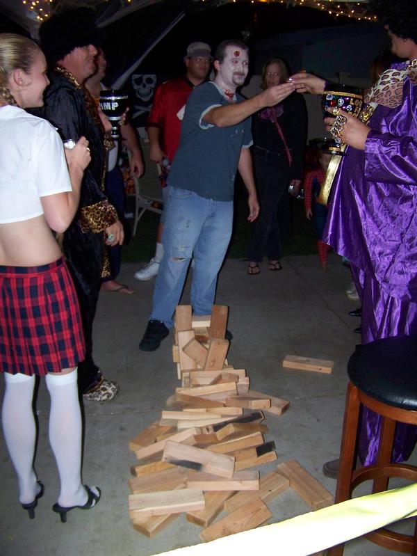 On the near side of the yard we kept a fire pit going all night, and late in the party Jay started burning all kinds of interesting things, including stale potato chips. On the far side of the yard were three tables laid out with candles for people to sit and eat or chat. Surrounding the entire area were four speakers in the corners, allowing the music to be heard without needing to be too loud.